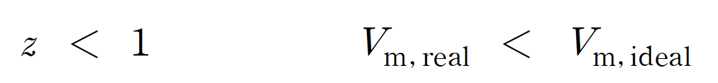 * 인력 우세 (기체 인력 > 기체 반발력) : 실제기체 몰부피 < 이상기체 몰부피 압축인자 ( z < 1 ) * 반발력 우세 (기체 인력 < 기체 반발력) : 실제기체 몰부피 > 이상기체 몰부피 압축인자 ( z > 1 )