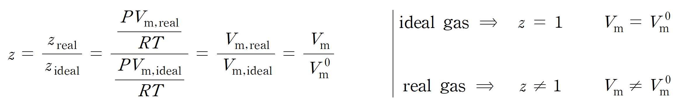 압축 인자는 이상 기체와 실제 기체의 차이를 보여주는 인자로, 이상 기체의 몰부피(molar volume, Vm)와 실제 기체의 몰부피 비(ratio)를 분수 형태로 나타낸 것이다. 다음을 살펴보자.