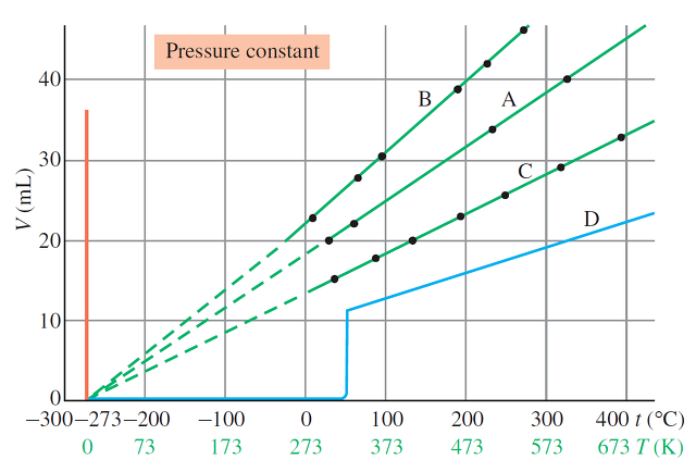 * 아래의 일정 압력 조건의 온도(T )- 부피(V ) 그래프에서 D(하늘색 그래프)는 특정 온도(323 K 부근)에서 급격한 부피 변화를 갖는다. 이는 물질이 액체로 상변화가 일어났음을 의미하며, 이것이 실제 기체에서 나타나는 일반적인 그래프 개형이다. 나머지 A, B, C 기체가 이상기체라면, 직선의 기울기 값을 유지한 1차 함수 형태로 외삽(점선---)되어 나타날 것이며, 한 점에서 만나게 된다.