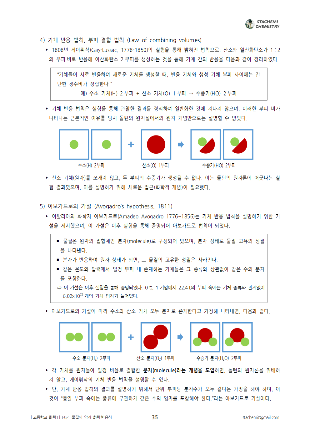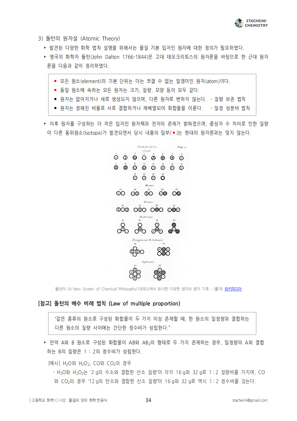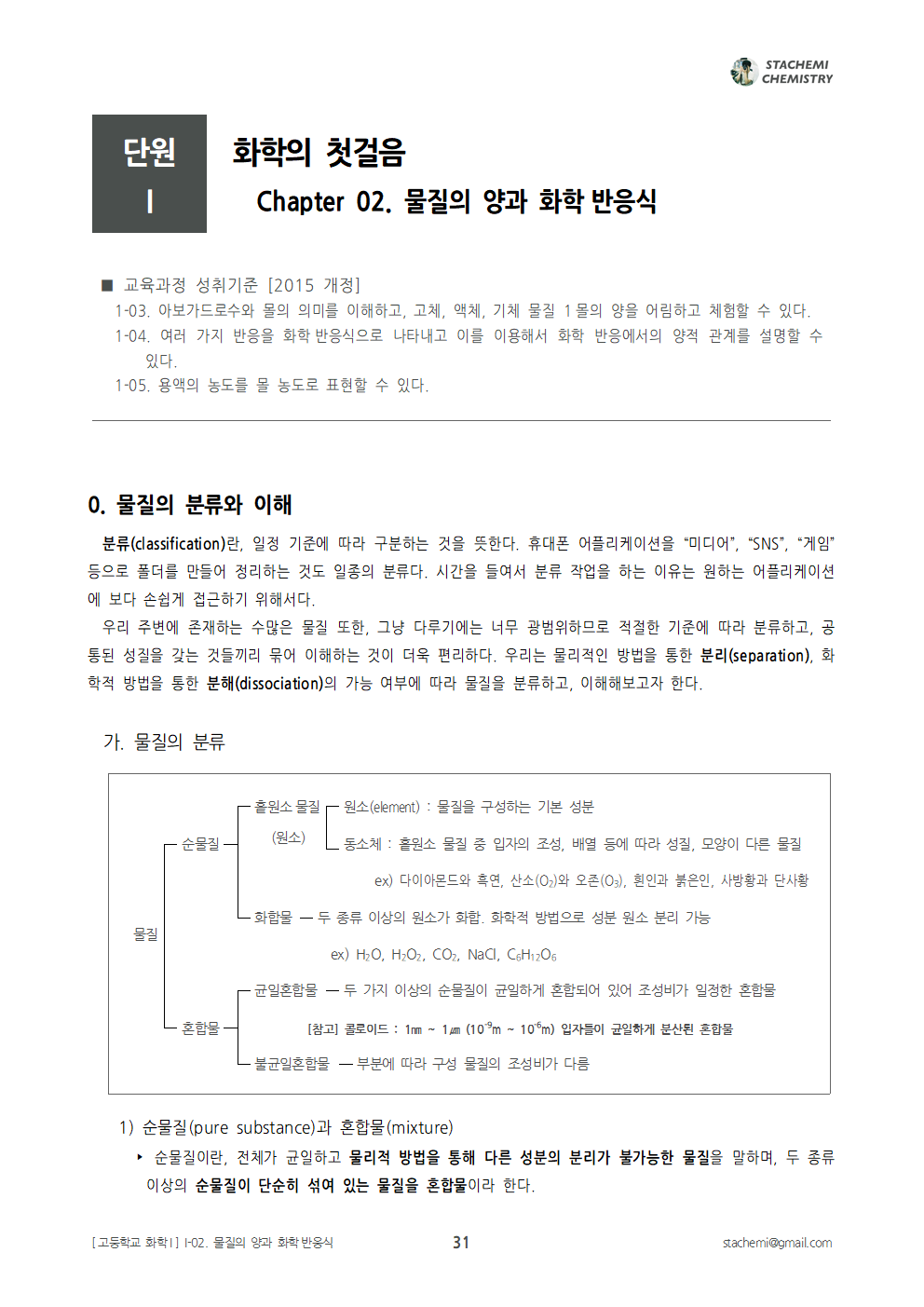 화학에서 주된 탐구 대상인 물질을 어떻게 분류하고, 어떤 용어들이 등장하는지를 살펴보아야 합니다. 따라서 이번에 포함된 학습지를 통해 물질을 분류해보고, 물질 구성의 단위 입자인 원자(atom)와 분자(molecule) 개념이 어떻게 등장하게 되었는지를 몇 가지 화학 법칙의 발견을 바탕으로 알아보고자 합니다. 참고로 여기서 다룬 질량 보존의 법칙, 일정 성분비의 법칙, 기체 반응의 법칙 등은 9학년(중학교 3학년) 교육과정입니다.