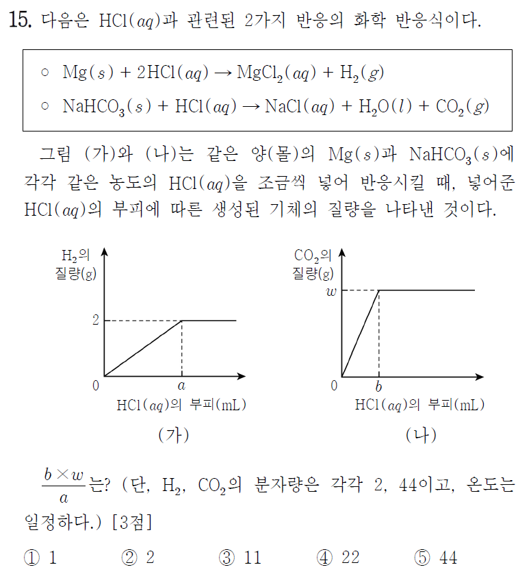 - 간략히 풀이하면, (가) 그래프의 생성된 H2의 질량을 통해 1 몰이 생성되었음을 알 수 있고, 반응에 참여한 Mg 1 몰, HCl은 2 몰임을 알 수 있다. Mg와 NaHCO3가 같은 몰수 사용되었다는 문제 조건에 따라 (나)의 NaHCO3 역시 1 몰 반응했으며, HCl 1 몰이 소모되어 CO2 1 몰, w=44 g을 생성함을 알 수 있다. a와 b가 부피 값이지만, 농도가 일정할 때, 몰수와 부피에 비례하므로, b/a 값은 1/2임을 알 수 있다. 따라서 bw/a 값은 22가 된다.