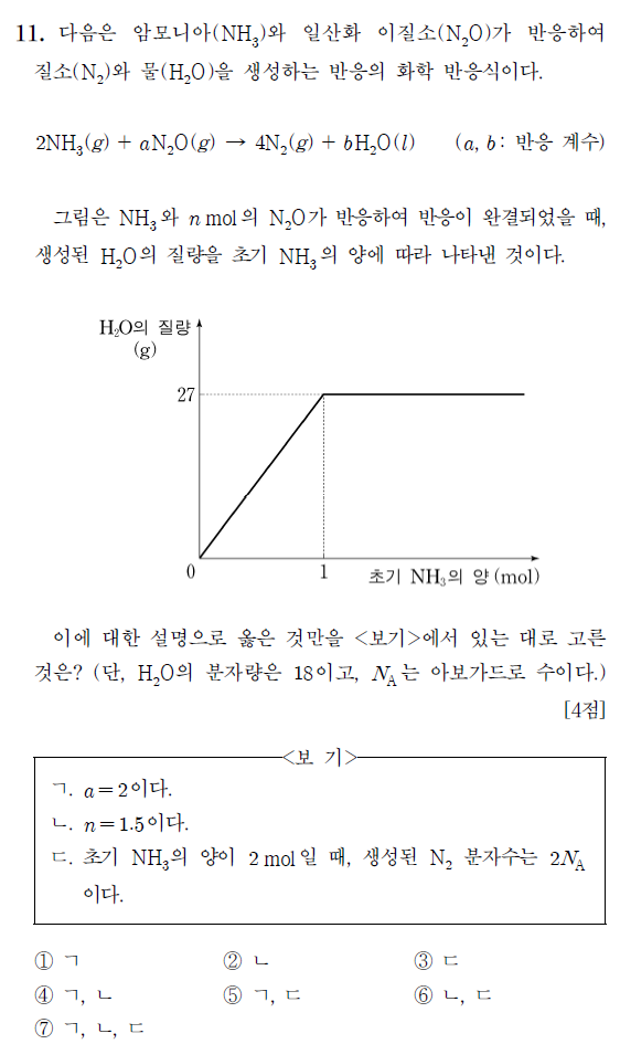 고등학생들에게는 다소 생소할 수 있는 암모니아(NH3)와 일산화이질소(N2O)의 반응이지만 당황할 필요는 없다. 화학 반응식이 완성되지 않았기에 가장 먼저 해야할 일은 N2O와 H2O의 계수를 결정하는 것이다. 억지로 미정계수법을 사용하도록 유도하여 단순 계산에 시간을 허비하게 하지 않아서 좋다.