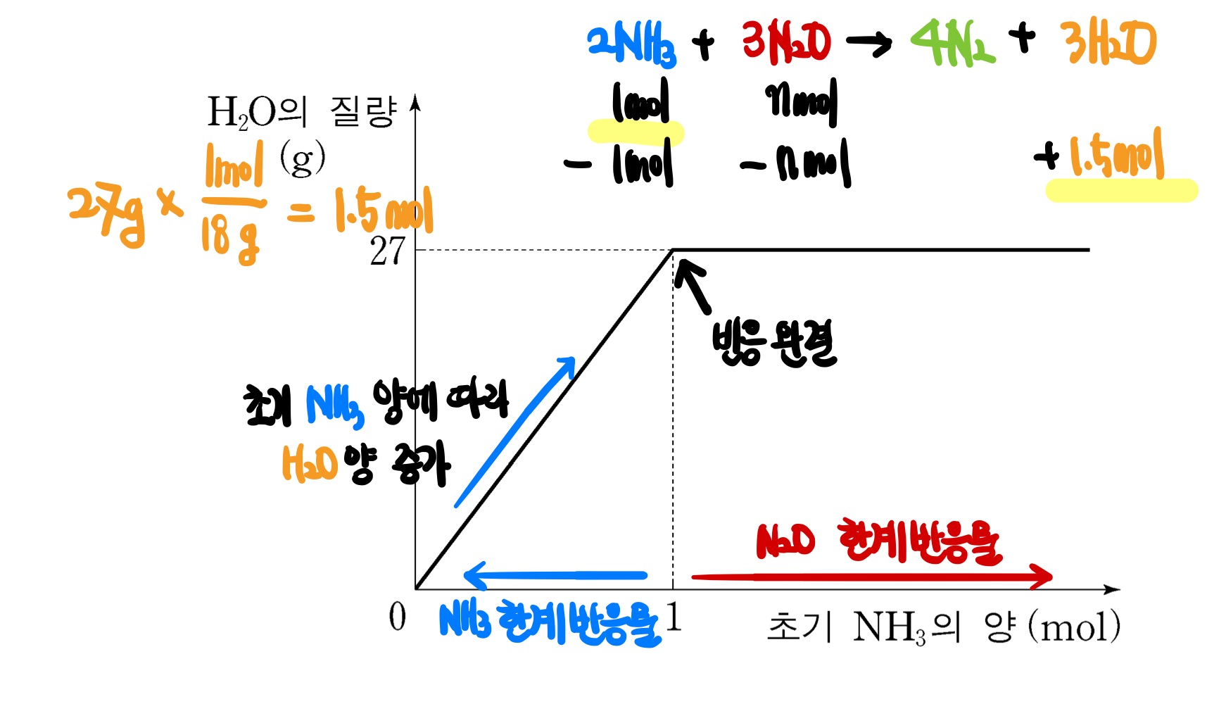 3) 주어진 그래프는 n 몰의 N2O와 반응한 NH3의 몰수에 따른 생성된 H2O의 질량 그래프이다. 질량 정보는 물의 분자량(18)을 이용하여 몰 정보로 바꾸자. 그래프에서 NH3의 양을 1 몰 보다 늘려도 생성된 H2O 질량이 27 g(1.5 몰)에서 더 이상 늘어나지 않는다는 것은 N2O가 한계 반응물이라는 것을 말해준다.