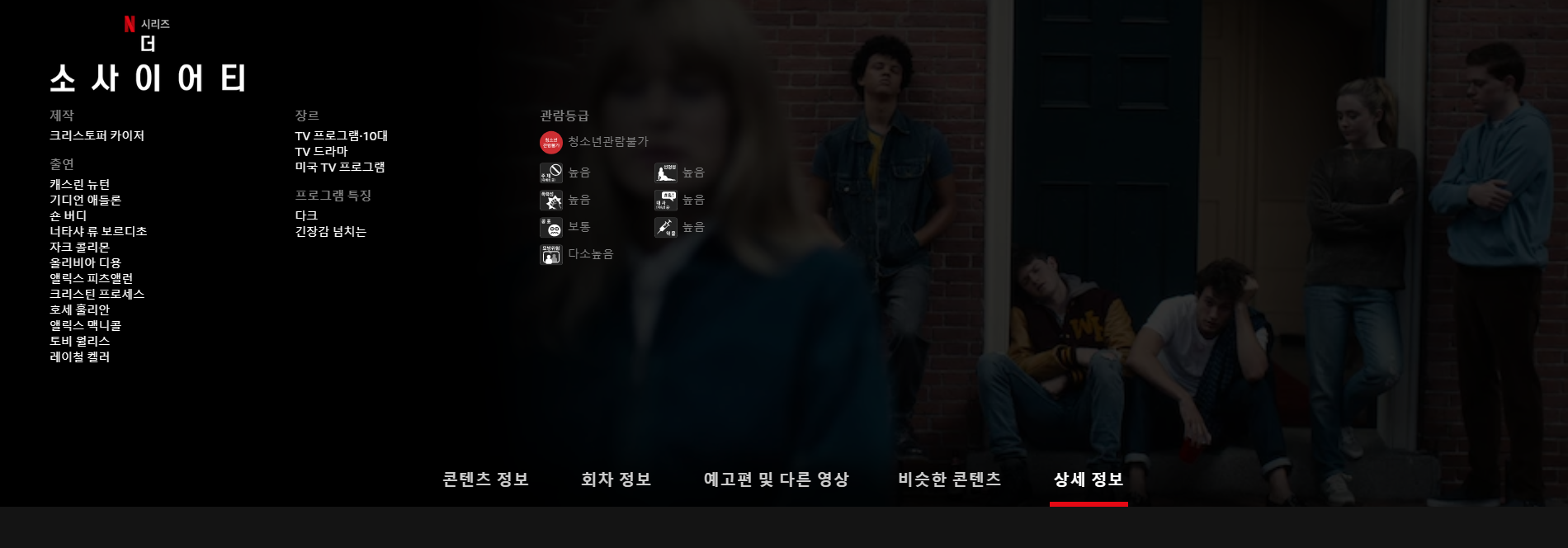 * 더 소사이어티는 2019년 5월에 공개된 미국 드라마인데, 흥미를 불러일으키는 시놉시스 때문에 찜해두었다가 자연스레 보게 되었다. 현재 시즌 1만 공개되었는데 시즌 2는 올해(2020년) 공개될 예정이다. 청소년들이 주인공이지만, 관람 등급은 청소년 관람불가이다.