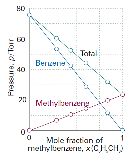 마치 기체 혼합물의 성분 기체들이 보일-샤를 법칙을 만족하 듯, 액체 혼합물의 성분 액체들은 라울 법칙을 만족한다. 실제로 벤젠(benzene)과 톨루엔(methylbenzene)은 분자 구조가 매우 비슷하여 혼합 후 이상 용액처럼 행동한다.