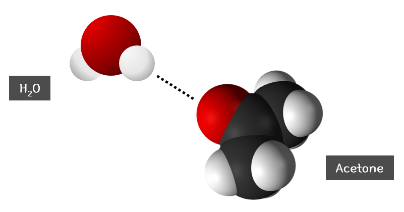 <그림 3>과 같이 아세톤이 물(H2O)과 혼합되면, 순수한 용매 상일 때는 가능하지 않던 수소 결합을 형성할 수 있게 된다. 혼합 전에는 없었던 강력한 분자 사이 상호작용이 분자들을 열역학적으로 안정화시킨다. 이는 아세톤과 물이 서로를 구분할 수 없고 단순히 섞여만 있던 이상 용액 환경보다 증기를 만들기 어렵게 한다. 따라서 증기압은 낮아지며, 이상 용액의 직선 그래프와 비교했을 때, 아래로 쳐지는 음(-)의 편차를 갖게 한다.