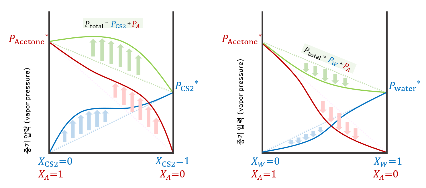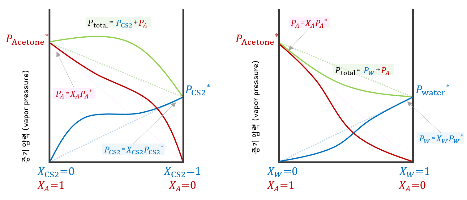 붉은색 아세톤 증기압 곡선은 XA=1 부근에서, 푸른색 CS2와 물의 증기압 곡선은 Xw=1 (XCS2=1) 부근에서 이상 용액 그래프(직선)와 편차가 거의 없다. 이 부근의 공통점은 용질이 매우매우~~ 적게 포함되어 순수한 용매 성질에 매우매우~~ 가까울만큼 묽은 용액이라는 것이다.