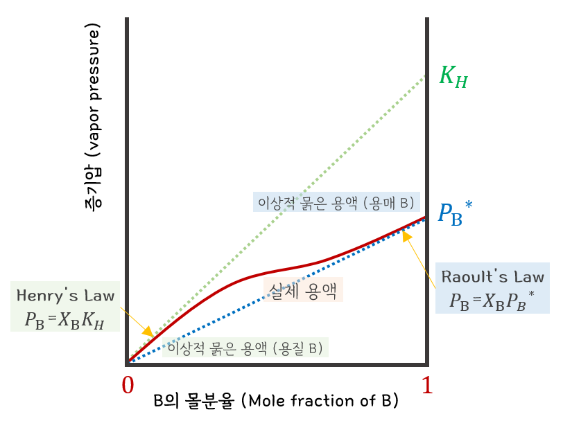 <그림 6>은 실제 용액 내 B 증기압 곡선(붉은색)을 나타낸 것이다. B 증기압 곡선 양 극단은 이상적 묽은 용액 조성을 가지며, B가 용매로 작용하는 구간(XB≒1)에서는 라울 법칙이, 용질로 작용하는 구간(XB≒0)에서는 헨리 법칙이 적용되는 것을 알 수 있다.