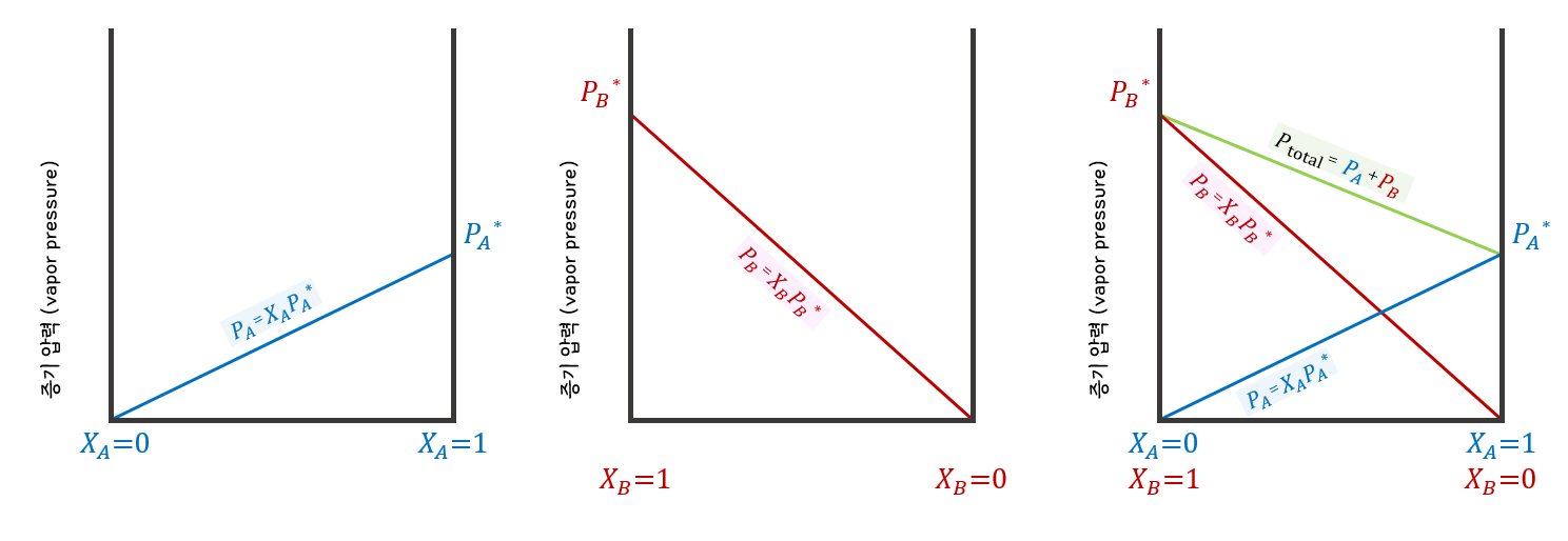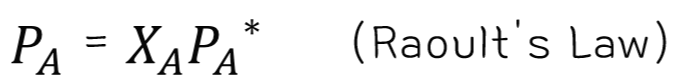 라울 법칙(Raoult's Law)은 몰분율(=XA)과 증기압(=PA) 사이의 관계를 나타낸 식이다. 몰분율을 x, 증기압을 y 로 하여 그래프를 그렸을 때 몰분율 0부터 1까지 전체 구간에 대해 기울기가 PA* 인 직선 형태를 보인다면, 그 용액은 이상 용액이다.