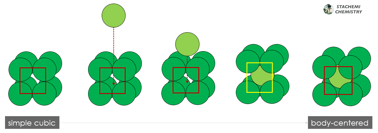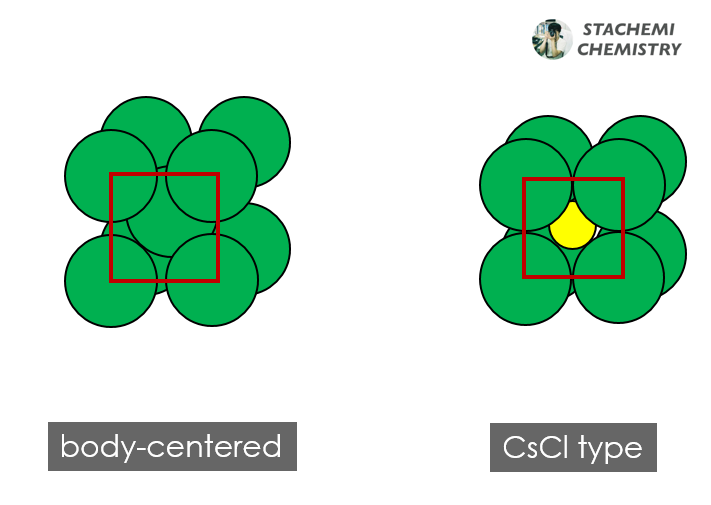 CsCl 구조는 상대적으로 크기가 큰 입자(초록색)가 만들어 낸 가운데 틈새 자리(빈 공간)크기에 잘맞는 입자(노란색)를 끼워 넣은 것이다. 예를 들면, 농구공 8개로 단순입방구조를 만들고 중간 틈새 자리에 딱 맞을 크기의 야구공을 끼워 넣은 것이 CsCl형 구조이다. 반면, 체심 입방 구조는 가운데 빈 틈에 똑같은 크기의 농구공을 욱여넣어 기존의 농구공들이 조금씩 밖으로 밀려나가 만들어진 구조이다. 결과적으로 틈새 자리에 더 큰 입자가 채워진 체심 입방의 크기가 기존 단순 입방보다 커진다. (위 <그림 7>의 체심 입방 구조는 CsCl형과 달리 꼭짓점에 위치한 입자들끼리 서로 맞닿아있지 않음에 주목하자.)