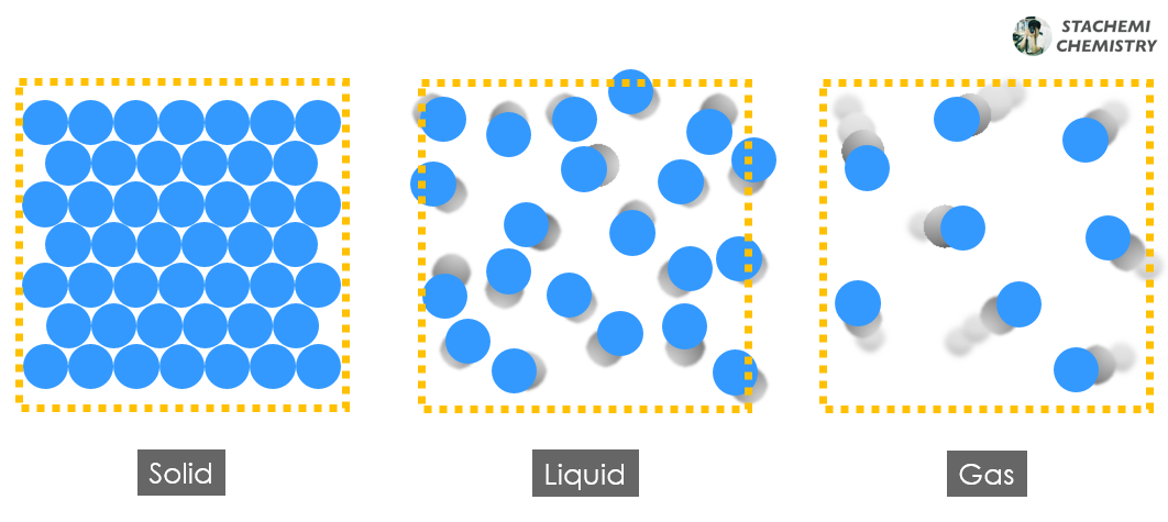물질의 상태는 고체(solid), 액체(liquid), 기체(gas) 세 가지로 구분된다. 상태는 물질을 이루는 입자 간 거리에 따라 구분된다. 입자 간 거리가 멀면 기체, 매우 가까우면 고체이다. 적당히 가깝고도 멀면 액체이다.