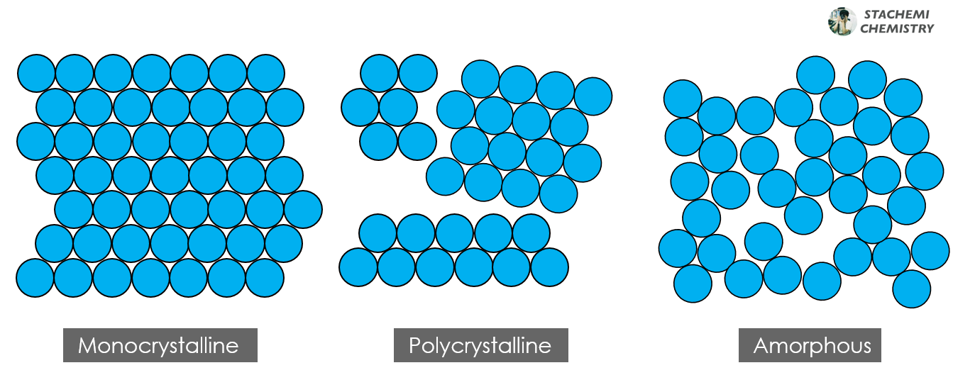 그림 2. 배열의 규칙성에 따른 고체의 분류 (단결정, 다결정, 비결정)