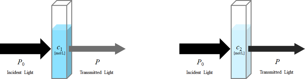 농도 c 와 빛의 통과 길이 b 에 대한 두 법칙을 조합한 것이 "비어-람베르트 법칙(Beer-Lambert Law)"이다.