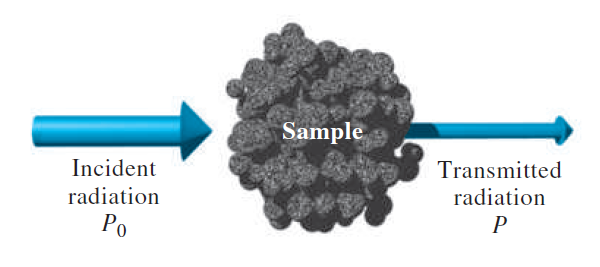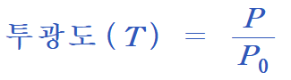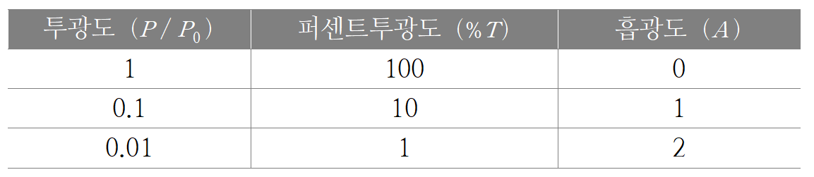 장치는 우리에게 투광도(transmittance, T ) 형태로 정보를 준다. 투광도는 '처음 빛의 세기(P0 )'와 '검출된 빛의 세기(P )'의 분율이다.