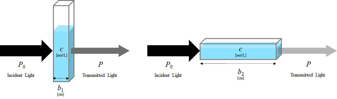 분광 광도계로 흡광도를 측정할 때, 분석할 물질(시료)을 셀(cell) 또는 큐벳(cuvette)이라고 불리는 용기에 담게 된다. 큐벳의 가로, 세로 길이가 1 cm인 것을 사용하는 것이 보편적이다. 이에 빛이 통과하는 거리인 b 값은 거의 고정되어 있기에 상수처럼 취급할 수 있다.