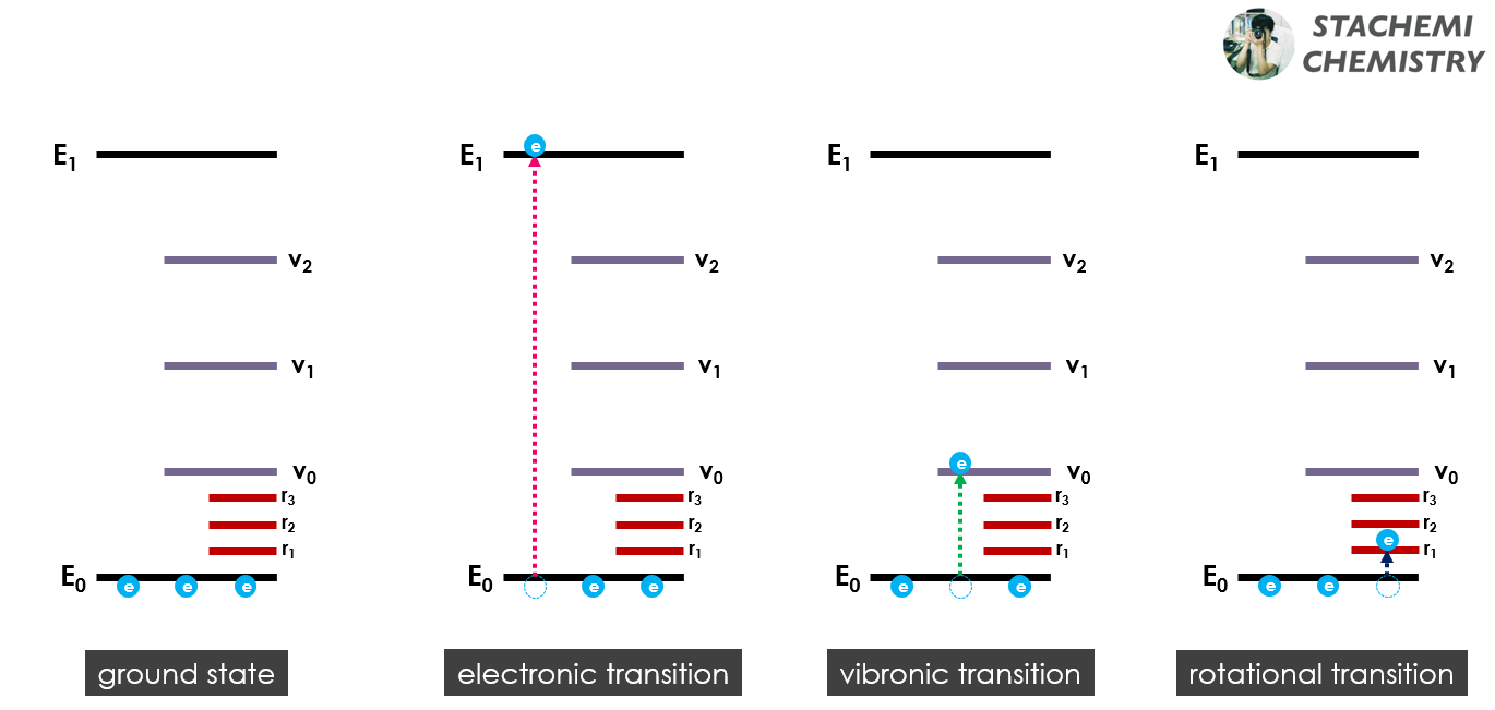 분자가 빛을 흡수하면 분자의 에너지가 높아진다. 쉽게 말해 들뜬상태(excited state)가 된다. 분자가 흡수했던 빛을 방출하면 에너지는 낮아진다. 분자의 가장 낮은 에너지 상태를 바닥상태(ground state)라 한다.