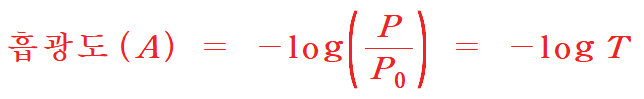 통과한 비율인 투광도가 0.2면, 흡수한 비율은 0.8 아닌가?라고 되물을 수도 있겠다. 하지만 시료가 빛을 흡수한 정도를 나타내는 흡광도(absorbance, A)는 다음과 같이 정의된다.