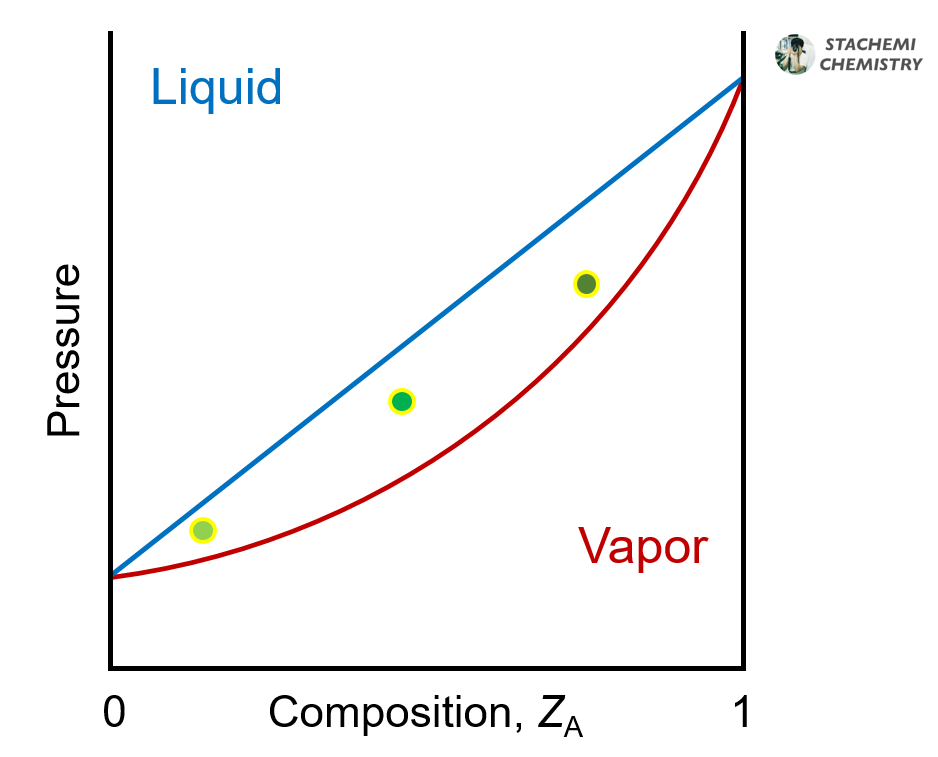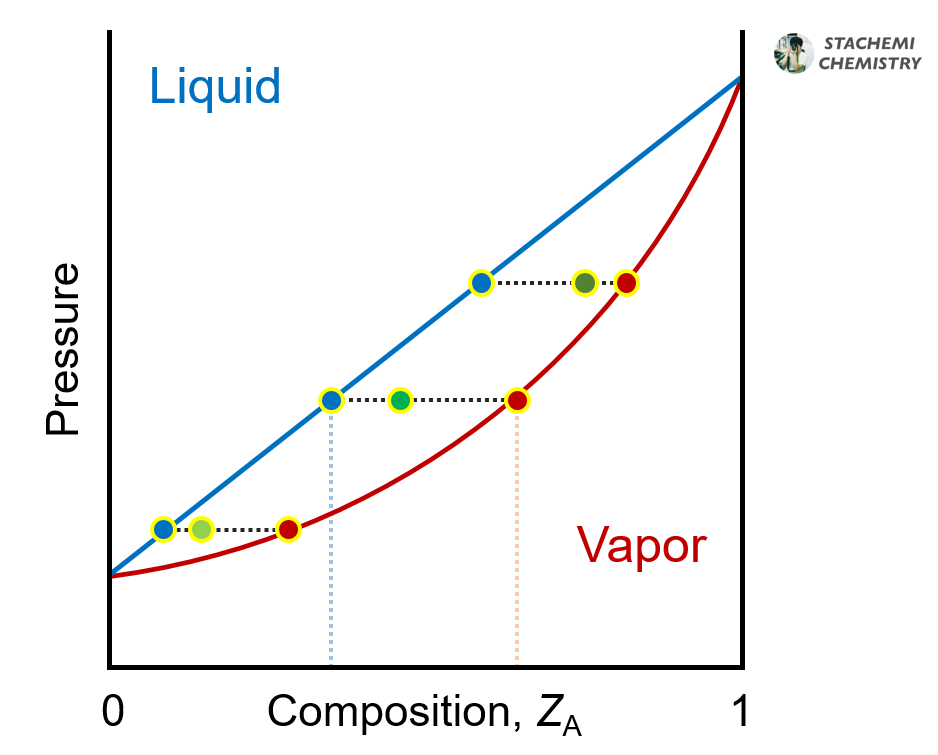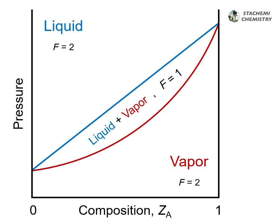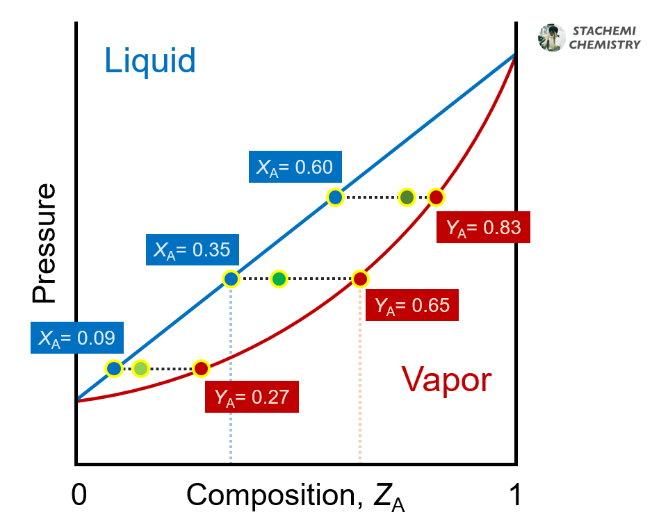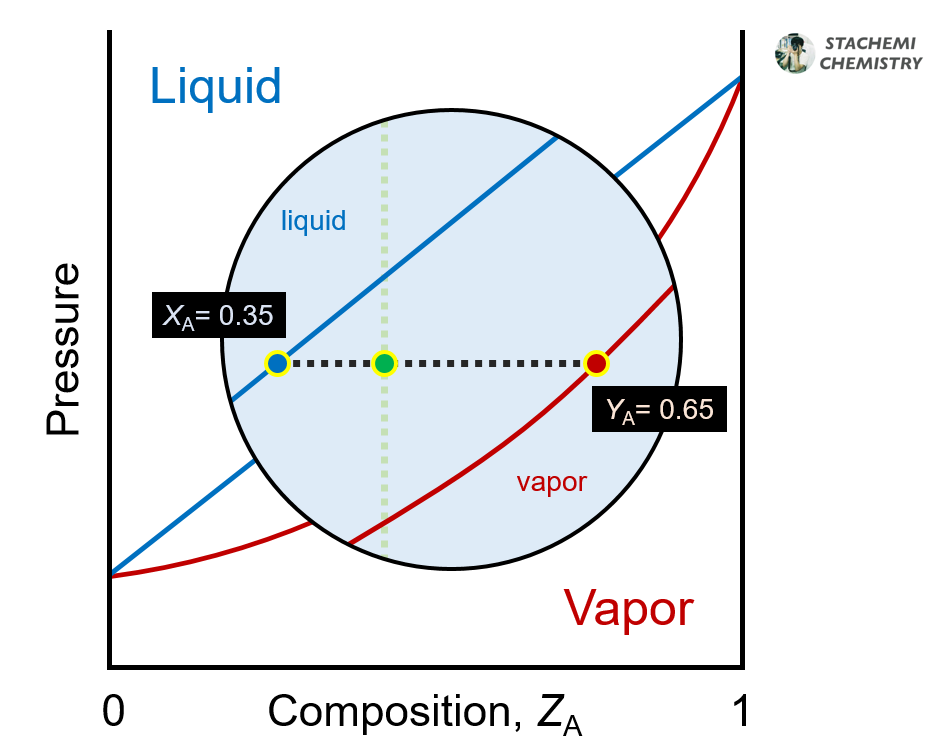 따라서 용액과 증기가 공존하는 영역 내에서, 임의의 증기압(y축 값)을 선택하면 평형 상태의 용액과 증기의 조성은 자동으로 결정된다.
