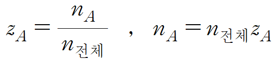 * 전체 물질(n전체)의 양과 포함된 A의 양(nA)을 통해 전체 물질 중 A가 차지하는 분율(zA)을 정의할 수 있다. (3)