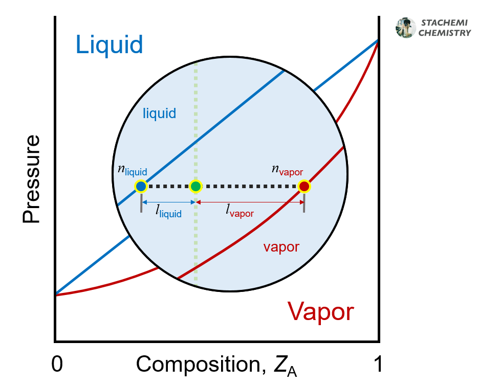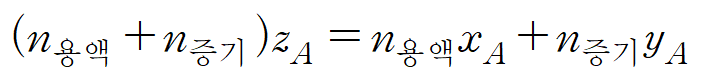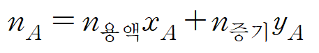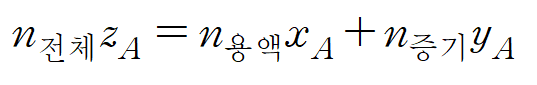 * 상을 고려하지 않은 전체 물질(n전체) 중에 포함된 A의 양(nA)만을 알고 싶다면, 용액에서의 A의 분율(xA), 증기에서의 A의 분율(yA)을 고려하여 더해주면 된다. 용액 중 포함된 A의 양은 n용액*xA이며, 증기 중 포함된 A의 양은 n증기*yA이다. (2)