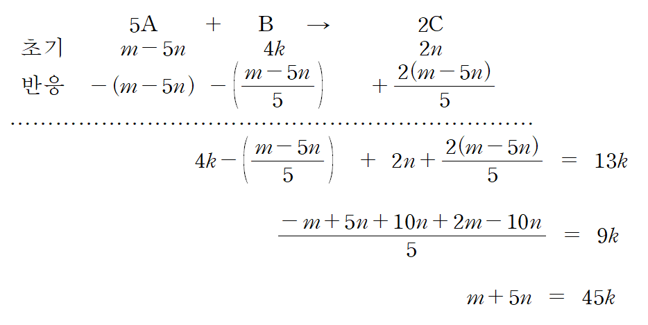 m 몰의 반응물 A와 n 몰의 반응물 B를 반응시켜 C를 생성한다. 과정 (가)에서 반응이 완결되었다고 했으므로, A와 B 중 한 화학종은 완전히 소모되었다는 것을 알 수 있다. 완전히 소모되어 반응을 완결시킨 반응물을 한계 반응물(limiting reactant)이라고 한다.