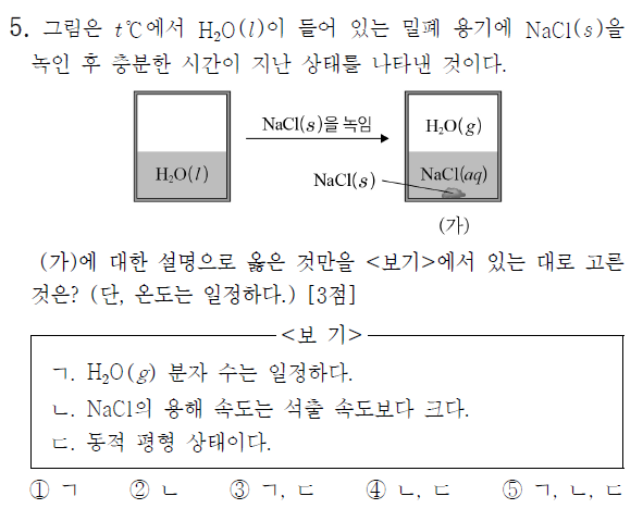 ㄴ. 고체 NaCl이 용해되는 속도와 NaCl 수용액으로부터 NaCl이 석출되는 속도가 같아 겉보기에 아무런 반응이 진행되지 않는 것 처럼 보인다. (거짓)