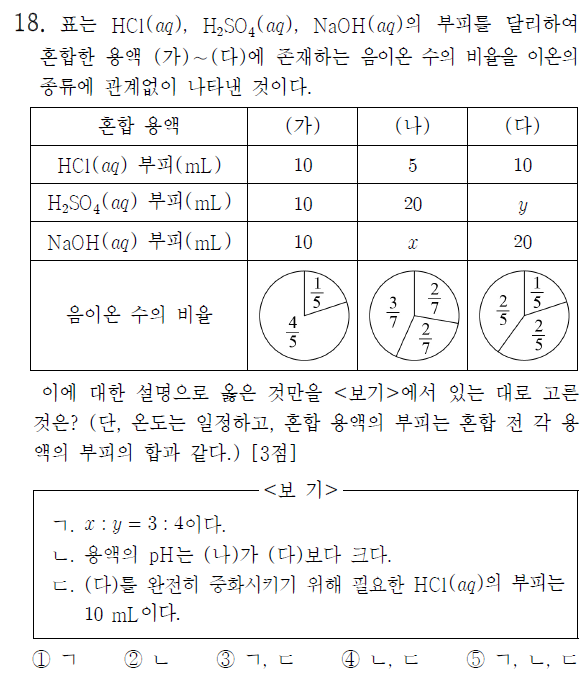 산-염기의 탈을 쓴 '~이라면', '~이라면' 문제다. 음이온 수의 비율로 부피에 대한 몰수를 찾고, 몇 번의 가정을 통해 미지수를 구해야 한다. 전하 균형을 고려할 수 있다면, 풀이 시간을 조금 단축시킬 수 있다. 학생들의 시간을 어떻게든 더 뺏기 위해 이양성자 산인 황산까지 동원했다. 개인적으로는 문제를 위한 문제를 냈다고 밖에 보이지 않는다. 학교 현장에서 화학을 가르치는 입장지만, 내 학생들이 이 문제를 시간 내에 완벽히 풀었다고 말해도 하나도 기쁘지 않을 것 같다. 역시 개인적인 생각이다. 이상 넋두리 끝.