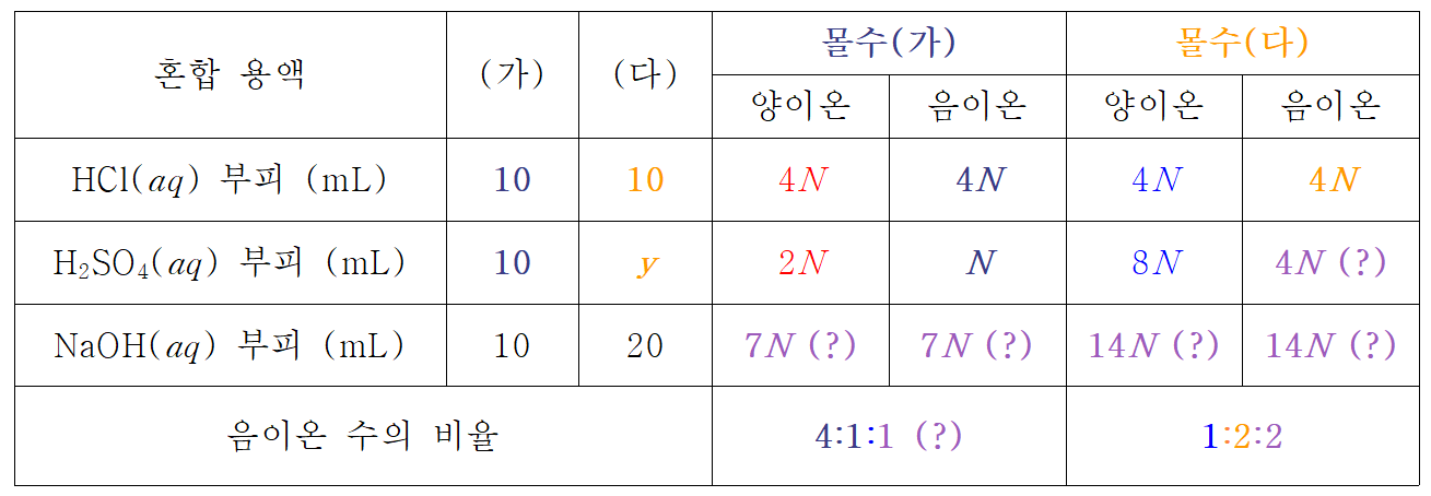 만약, 4N 의 Cl-이 1:2:2의 1에 해당한다면, 2배인 SO42- 음이온은 8N, 남아있는 OH- 이온도 2배인 8N 개가 된다. 이 경우 (다) 용액에 존재하던 4N + 16N = 20N 개의 수소이온과 모두 반응하고 남은 OH- 이온이 8N 개이므로, 초기 NaOH 20 mL가 28N 개가 된다는 말이 된다.