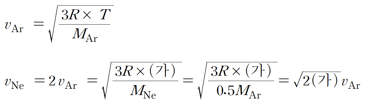 ㄱ. 아르곤(Ar=40)의 화학식량이 네온(Ne=20)의 2 배이므로, 같은 온도라면, 반응속도가 √2 배 빨라야 한다. 주어진 표에서 기체 원자의 평균 속력이 2 배 빠른 것을 보아 온도 또한 2 배 높은 조건이라는 것을 알 수 있다. 온도가 두 배 높으면, 기체의 속도가 √2배 빨라진다. 따라서 (가)의 온도는 2T 이다. (참)
