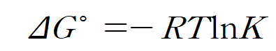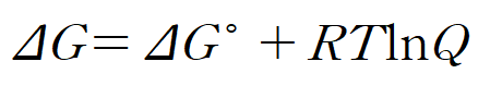 평형 상태에서는 반응지수 Q = 평형상수 K 이며, ΔG = 0 이다. 따라서 식은 다음과 같이 정리된다.