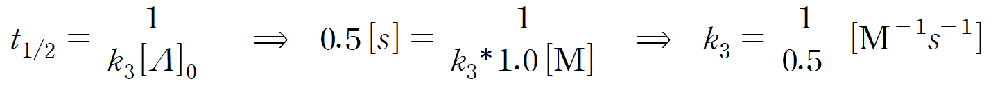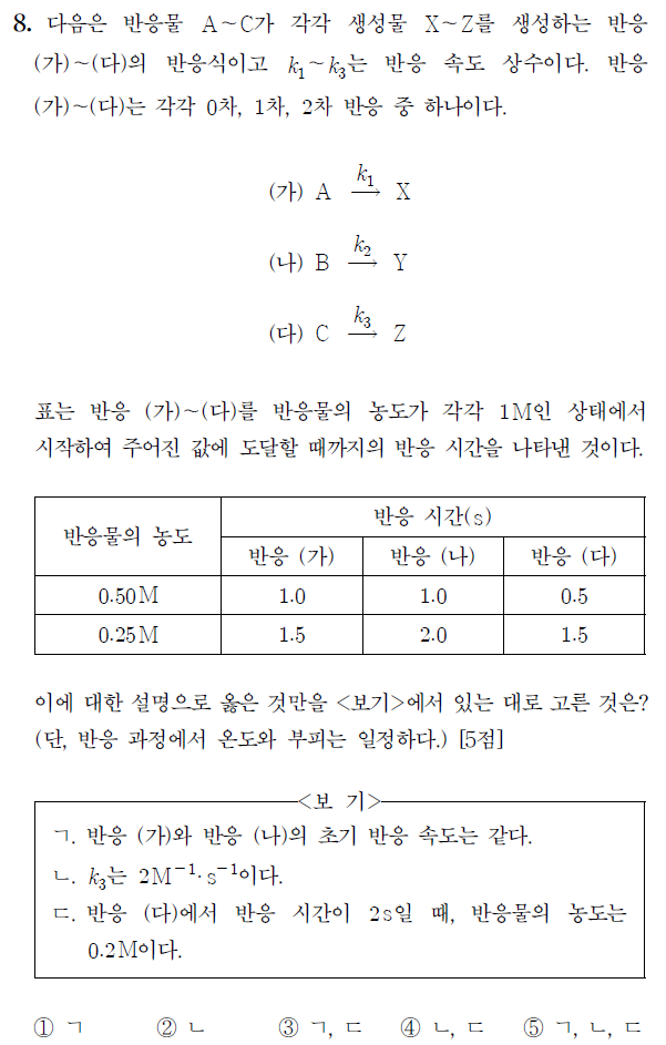 ㄴ. (다)의 속도상수는 초기농도 1.0M과 반감기 0.5초를 통해 구할 수 있다. 2차 반응의 반감기 t = 1 / k[A]0 이다. 따라서 k = 1/ t [A]0 이며, k = 1 / (0.5*1) = 2 (Ms)-1 이다. (참)