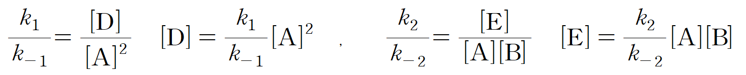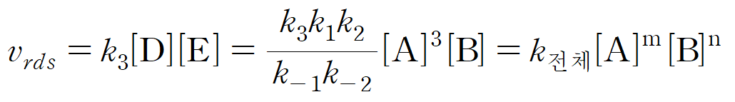 단계 1과 단계 2의 반응이 사전 평형에 도달했으므로, D와 E의 농도가 일정하게 유지되고 있다고 근사할 수 있다. 이에 단계 3의 D와 E의 농도를, A와, B로 표현할 수 있다. 속도 결정 단계(rds)는 3단계이며, 반응 속도식은 다음과 같이 나타낼 수 있다.