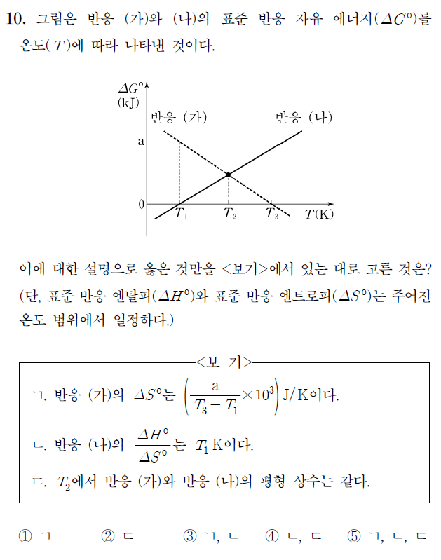그래프를 통해 T 2에서 반응 (가)와 (나)의 표준 반응자유에너지(ΔG ˚ )가 같음을 알 수 있다. 따라서 평형상수 K 또한 같은 값을 갖는다. (참)