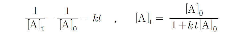 k = 2, t = 2, [A]0 = 1 을 대입하면, [A] = 1 / (1+4) = 0.2 M 임을 알 수 있다. (참)
