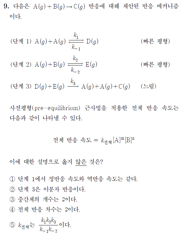 (1) 단계 1은 뒤의 반응에 비해 상대적으로 매우 빠르게 사전 평형에 도달했으며. 이에 정반응의 속도와 역반응의 속도가 같게 유지되고 있다. (참)
