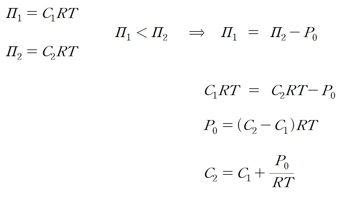 그림 (가)는 C2 용액에 P0 만큼의 압력을 가하여 용매 이동이 전혀 일어나지 않았다. 즉, P0는 두 용액의 초기 농도 차이에 해당하는 삼투압(Π)이다. 반면, (나)는 용매의 이동이 발생하여 두 용액 간 높이 차(h )가 발생했으며, 용액의 농도가 초기와 달라졌다.