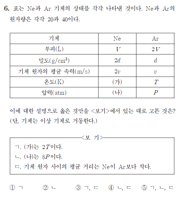 ㄴ. 두 기체 모두 이상기체 상태방정식을 만족해야 한다. PV = nRT 를 만족한다고 했을 때, 아르곤의 몰수는 2 mol 이며, 부피 내 질량은 80g이라 할 수 있다. 밀도 d = 질량/부피이며, d = 80g / 2V = 40g / V 로 나타낼 수 있다.