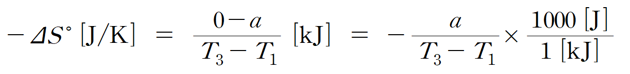 ㄱ. 반응 (가)의 기울기를 묻고 있다. 주의해야 할 점은 기울기의 단위이다. 일반적으로 자유에너지(ΔG ˚)와 엔탈피(ΔH ˚)는 [kJ] 단위를 사용하기 때문에, y 축 단위가 [kJ]로 표시되어 있다. 그런데, (가)에서 엔트로피의 단위로 [J/K]을 요구하고 있다. (원래 표준 엔트로피 변화량의 기본 단위이긴 하다.) 어쨌든 기울기는 y 변화량 / x 변화량 으로 구하여 단위를 고려해주면 다음과 같이 나타낼 수 있다. (참)