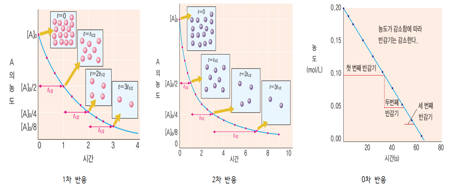 반감기를 통해 (가), (나), (다) 반응 차수를 찾아야 한다. 초기 반응물의 농도가 1.0 M이었으므로, 표를 통해 1차 반감기와 2차 반감기를 알 수 있다. (가)는 반감기가 1초에서 0.5초로 점차 감소하므로 0차 반응, (나)는 반감기가 1초로 일정하므로 1차 반응, (다)는 반감기가 0.5초에서 1초로 점차 증가하므로 2차 반응이다.