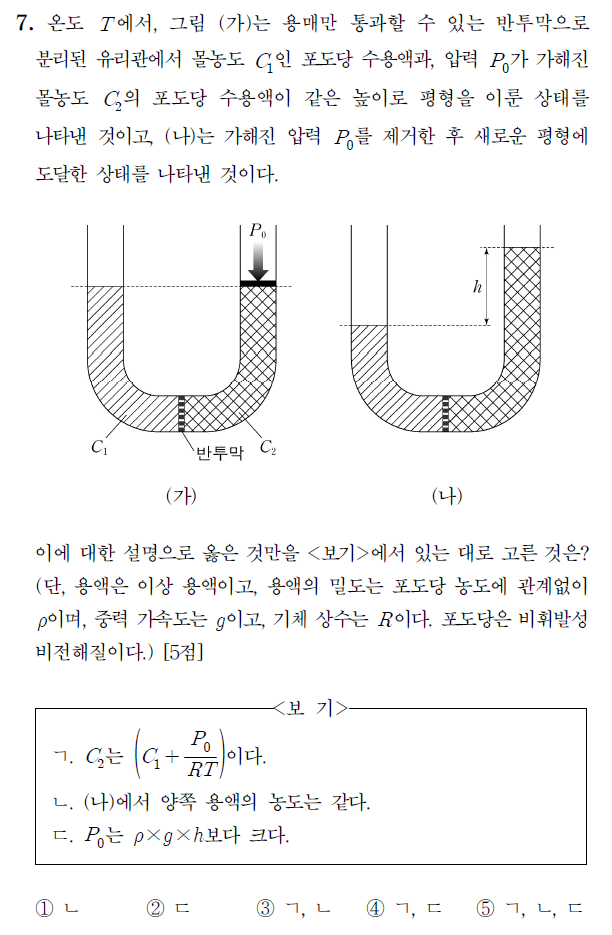만약, 문제 그림과 같은 U자 관에서 삼투 현상이 발생한다면, 용매가 이동하면서 높이 차가 발생한다. 이 때, 두 용액의 높이 차가 발생하지 않도록 처음부터 외부에서 가해주어야 하는 압력이 삼투압(osmotic pressure)이다. 삼투 현상이 발생하는 원인은 초기 농도 차이에 있으며, 두 용액의 초기 농도 차만큼의 압력 차가 발생한다.