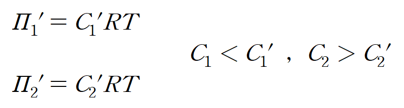 ㄴ. (나)의 경우 용매의 이동으로 C1 용액과 C2 용액이 변했으며, 더 이상 용매의 이동이 없는 상태이다. 용매의 이탈로 C1 용액은 진해지고, 용매의 유입으로 C2 용액은 묽어졌다. 임의로 (나)에서의 용액 농도를 C1', C2'이라 한다면, 두 용액의 압력은 다음과 같다.