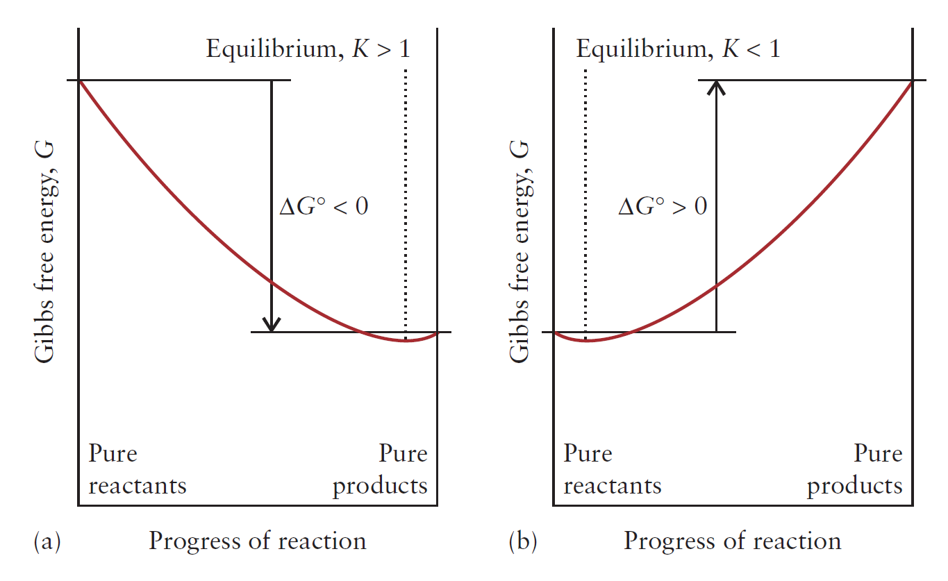 즉, 평형 상태에서의 반응물, 생성물 비율에 관한 인자인 평형 상수(K )는 표준 반응 자유에너지(ΔrG ˚)에 의해 결정되는 것을 보여주며, 이는 앞서 언급했던 반응물과 생성물의 자유에너지 차에 따른 극소점 위치 변화를 수식적으로 나타낸 것이라 할 수 있다.
