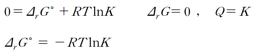 평형 상태란, 반응 자유에너지(ΔrG )가 0이 되는 순간이므로 이를 대입하면, 식이 다음과 같이 정리된다. 평형 상태에서의 반응지수 Q 는 평형상수 K 와 같다.