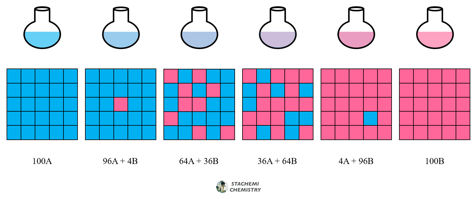 두 물질이 혼합계를 구성하면 계의 무질서도는 순수한 A 또는 순수한 B일 때보다 증가하고, 추가적인 자유에너지 기여분(안정도)이 생긴다. 그 기여분은 물질 분율에 의존하며, 자유에너지 기여분은 다음과 같은 식으로 나타낼 수 있다.