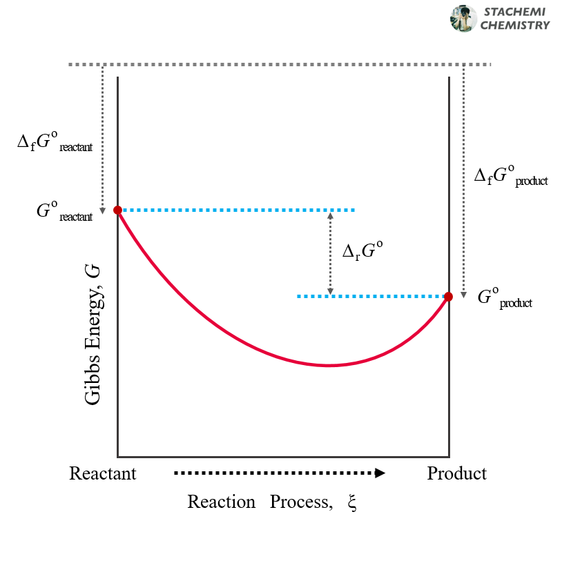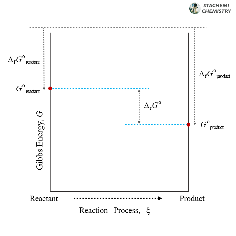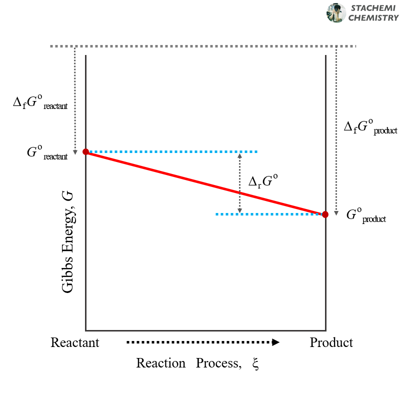 표준 반응 자유에너지(ΔrG ˚)는 표준 상태 생성물의 자유에너지(G ˚product)에서 표준 상태 반응물의 자유에너지(G ˚reactant)를 뺀 값이다. 이 값이 0 보다 작다는 것은 표준 상태 생성물이 표준 상태 반응물보다 자유에너지 측면에서 더 안정하다는 뜻이다. 참고로 모든 반응은 자유에너지가 작아지는 방향으로 자발적으로 진행되기 때문에 표준 상태 반응물이 자발적으로 변하여 표준 상태 생성물이 되는 것이 자유에너지적으로 유리하다.