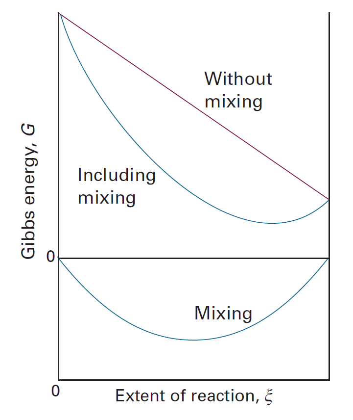 반응물과 생성물의 혼합 효과를 고려하지 않는다면, 반응 진행 정도와 관계없이 반응계의 자유에너지 변화량(기울기, dG / dξ)은 일정하다. 직선형을 갖기 때문에 항상 일정하게 감소하거나 일정하게 증가한다. 하지만, 혼합 효과를 고려한다면 더 이상 일정한 변화량을 갖지 않는다.