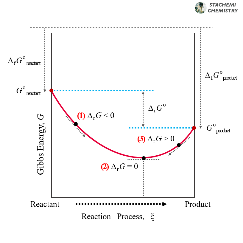 ΔrG = 0 : 반응계가 평형 상태(기울기 = 0)에 도달했다. 반응물과 생성물의 농도가 일정하게 유지된다.