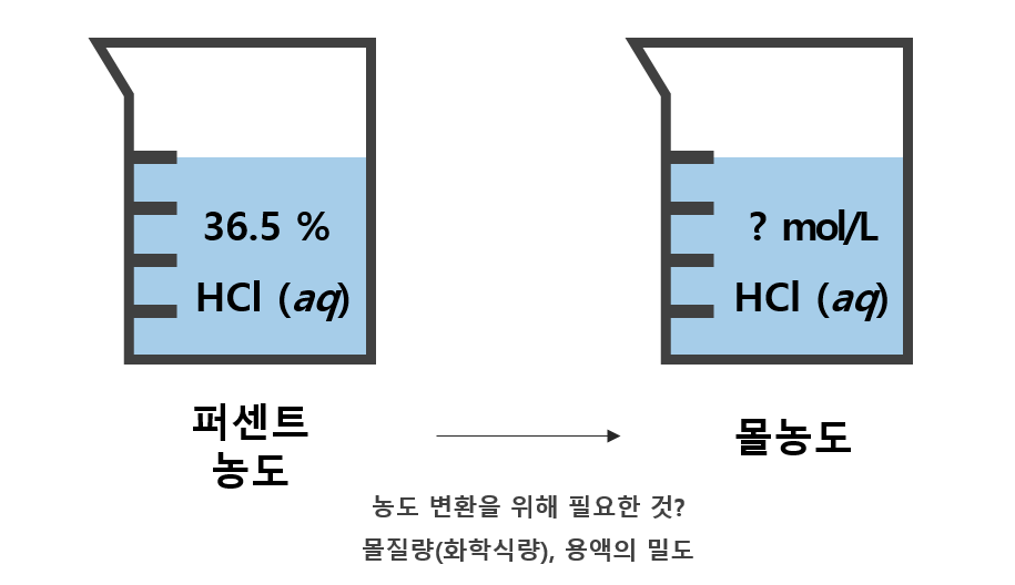 결국 우리가 만들고자 하는 농도의 형태로 변환해주는 과정이 필요하다. 퍼센트 농도를 몰농도로 변환하여 단순 희석을 통해 용액을 제조하는 것이 가장 간편하다. 그렇다면, 36.5 % 염산 용액은 몇 몰 농도 [mol/L]일까?