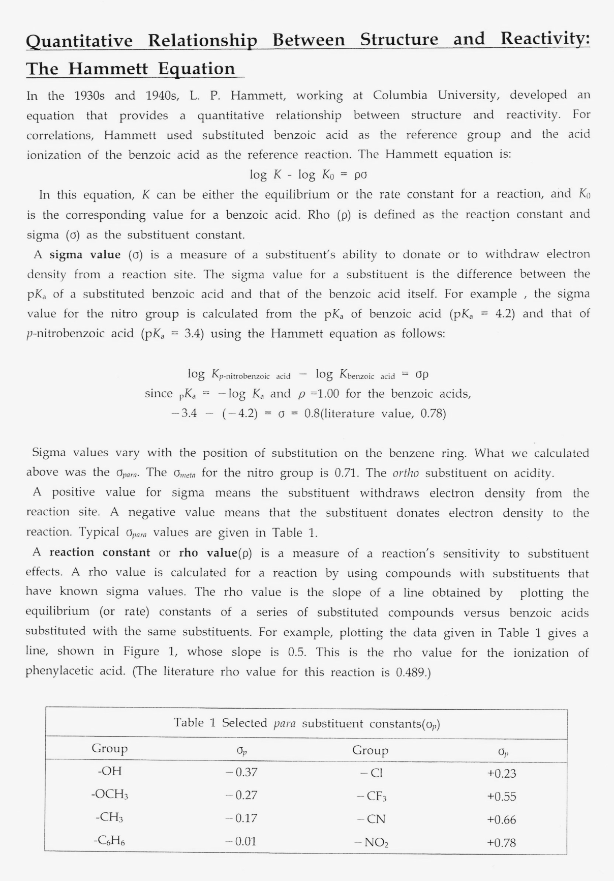 도시된 그래프의 기울기는 약 0.5이며, 이 값이 페닐아세트산의 반응 상수(ρ)이다. 페닐아세트산의 반응상수가 벤조산의 1보다 작다는 것은 페닐아세트산의 치환기 도입 효과가 벤조산에 비해 덜하다는 뜻이다. 같은 치환기를 같은 자리에 도입해도 해리 반응에 미치는 정도가 크지 않다는 뜻이다.