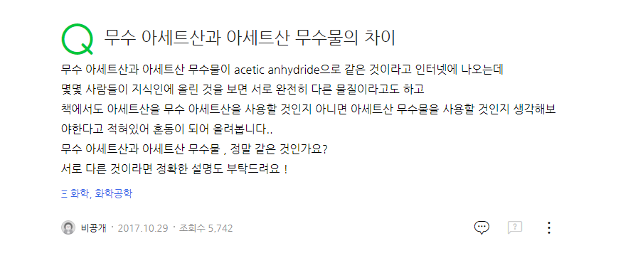 둘은 각자 의견을 뒷받침하기 위한 검색 찬스를 사용했지만, 명쾌한 결론을 주지 못했다. 와이프의 생각을 뒷받침하듯 '무수 아세트산'을 검색하면 '아세트산 무수물'이 결과로 나왔으며, 내 생각을 뒷받침하듯 그 둘은 다른 것이기 때문에 명확하게 구분되어야 한다는 내용도 꽤나 있었다. 포털 사이트 지식IN에도 이와 관련된 질문이 심심찮게 올라오는 것을 보면, 그간 다른 사람들도 명쾌하지 않았다는 것을 알 수 있었다.